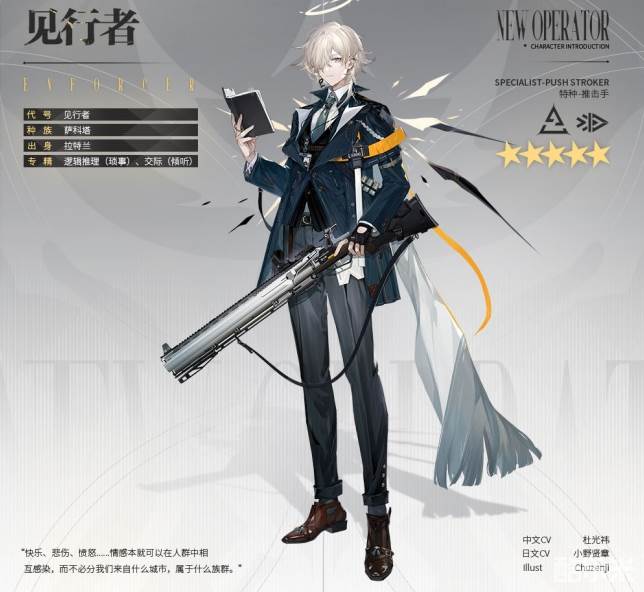 见行者的立绘并没有丢弃掉拉特兰干员们的优良传统,精致的面容和高质量的服饰铺面而来一股绅士的味道,手中的霰弹枪和送葬人手中的简直如出一辙,但是职业却是实打实的特种干员。