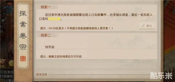 5、打开之后名玩家可以得到失踪的消息,知道每日午时至酉时在这里巡逻。