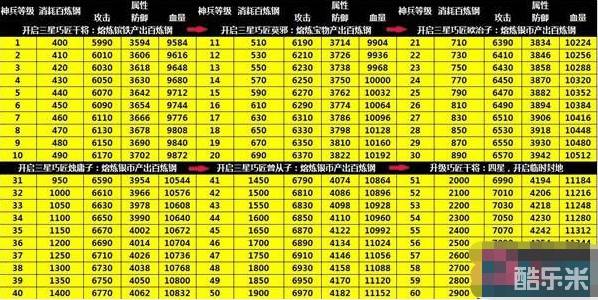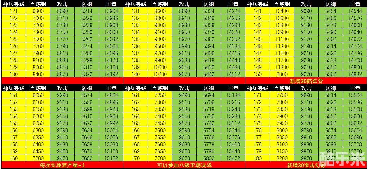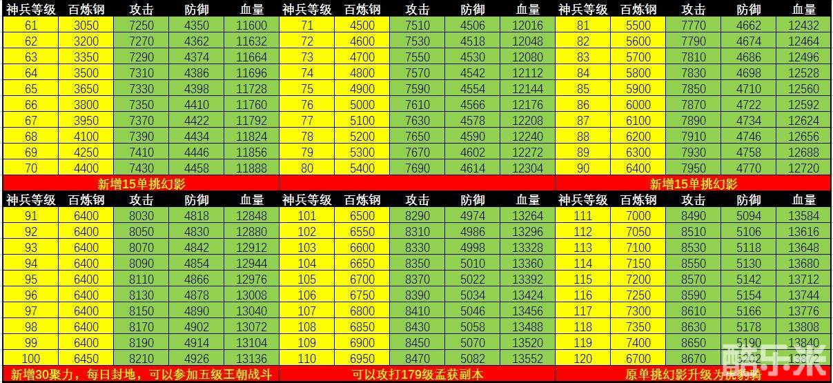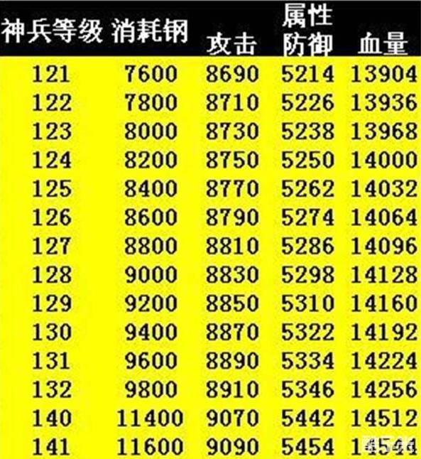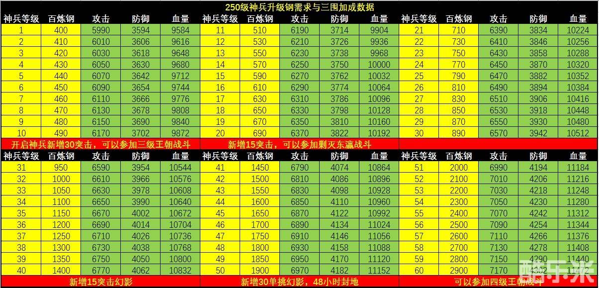以下是全部250级神兵的百炼钢消耗以及对应的三围加成数据:
