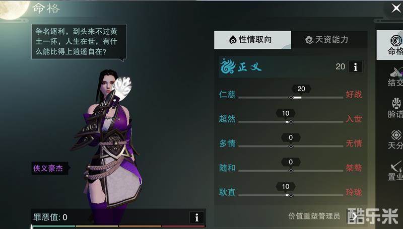 我们重做了命格系统,你们可以更加明显得到对自己江湖性格的反馈,养成命格可以触发奇遇、发放脸谱、解锁天分效果。并且在攻略NPC上,如果少侠的性格与NPC越相投,则更易结交。