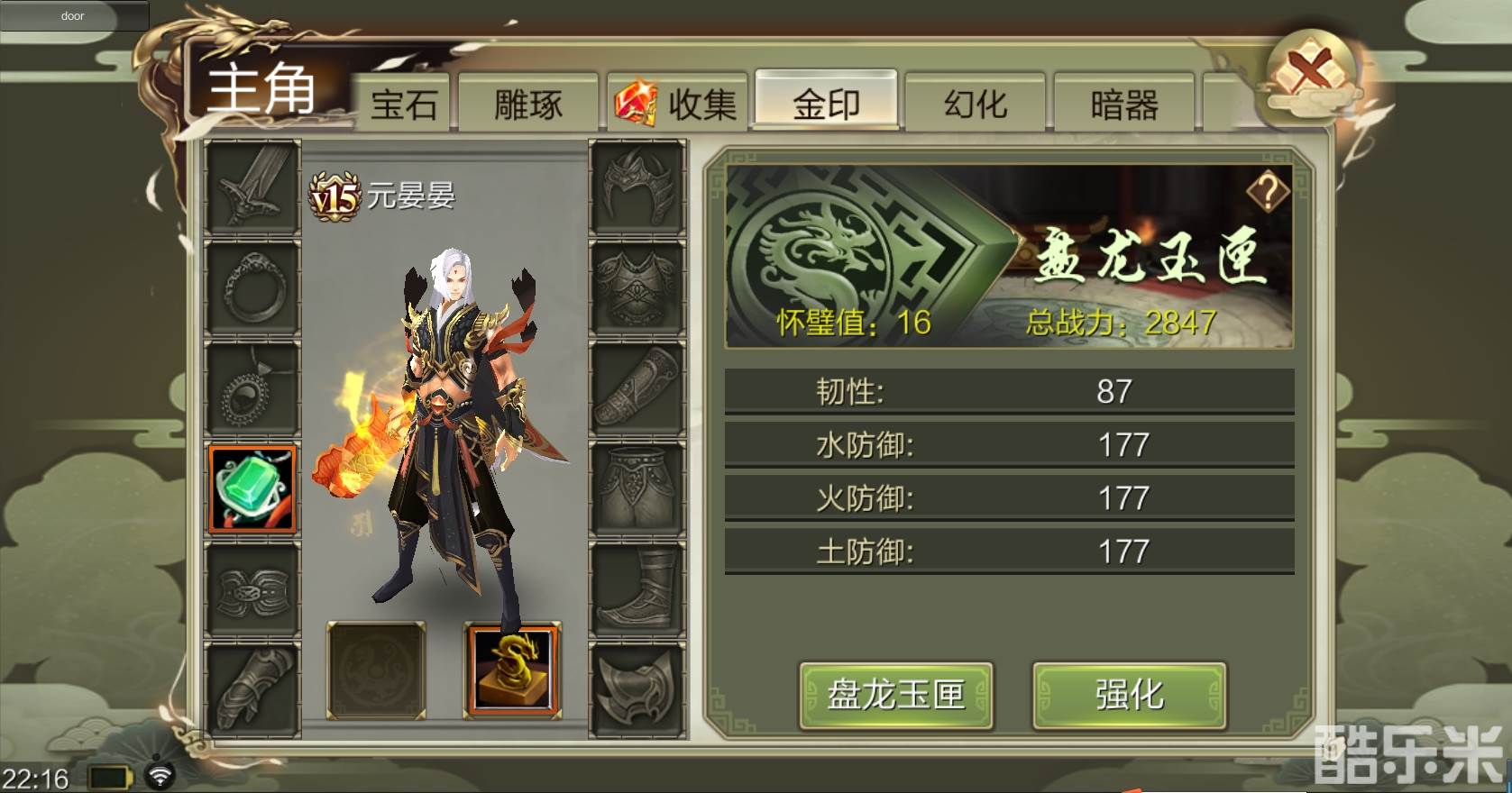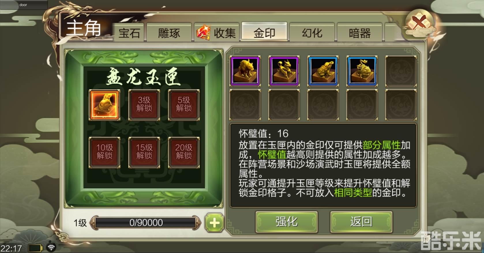 主要影响放置在盘龙玉匣内的金印的属性加成,侠士可以通过注入角色经验或使用【篆刻心经】来提升盘龙玉匣等级,盘龙玉匣等级越高则怀璧值越高,怀璧值越高则属性加成越多。