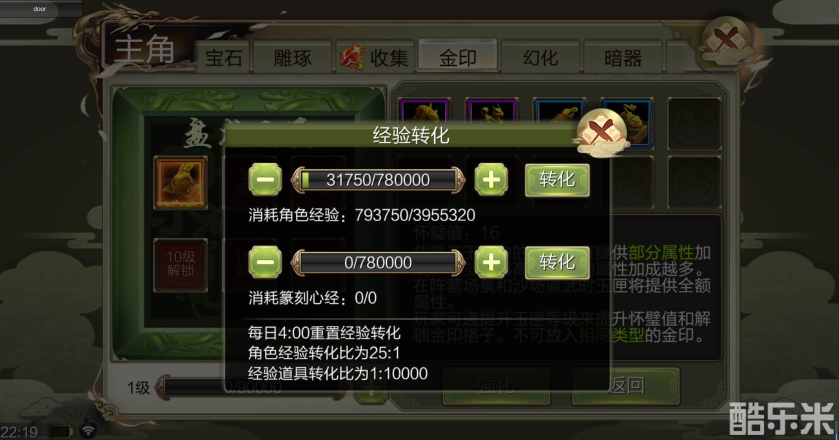 当侠士集齐某一种金印碎片后,可在乾坤袋中进行合成;而多余的金印碎片可在混元囊中提炼为【金晶】。
