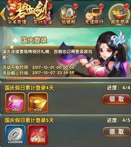 《碧血剑》本次国庆中秋双节活动分为多波活动,每一波活动都将推出不同的奖励,并且一波活动接着一波活动,根本停不下来。从10月1日一直持续到10月17日,长达半个多月的活动时间,让你天天有惊喜,日日有收获。只要每天登录游戏1小时,就可以领取福利欢乐一整天。