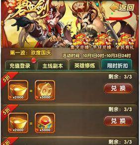 《碧血剑》国庆中秋双节活动形式多样,奖励丰富!除了零门槛的登录活动、集节日道具兑换活动和不同档次的充值送礼活动外,还有限时折扣活动,觉醒石、红色高级秘宝包、碧血红装碎片等半价优惠等你来抢;限时福利活动,登录送红装,排行送白虎,将红色喜庆送到您心里!