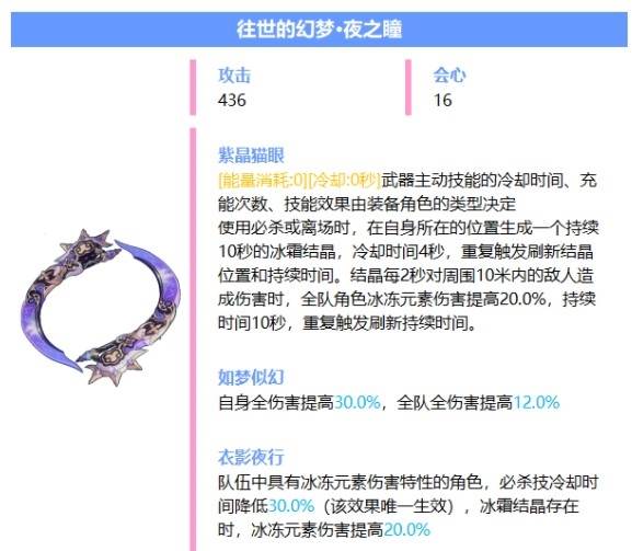 专属武器【往世的幻梦·夜之瞳】可以让「空梦·掠集之兽」在给全队提供较高的伤害增幅的同时附带减少全队冰属性伤害特性角色必杀技冷却时间的效果。