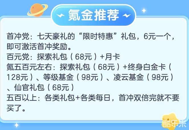 氪金五百元左右:探索礼包(68元)+终身白金卡(128元)、等级基金(98元)、凌云基金(98元)、仙官礼包(68元)