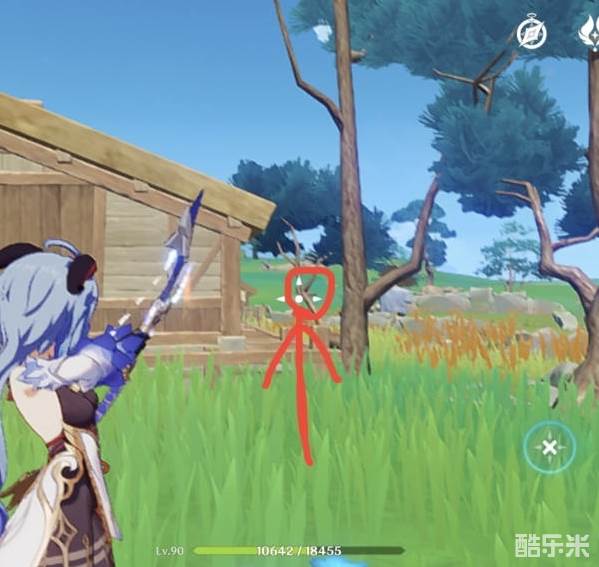 任务完成方法:站在原地,朝着图中圈出来的树的分叉口蓄力射击(无需蓄力满)连续射击,等到看到鸽子飞走了,过几秒会出现派蒙的提示对话,并提示事件已完成即可(完成后不需要角色走过去!)