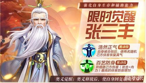 张三丰是武侠小说中武当派开山鼻祖,隐居后山的前辈高人,武当七侠之师,一套太极神功出神入化,以柔克刚,被推武学宗师。在《侠客风云传ol》中,张三丰抗伤害能力、防御能力、恢复力都相当不俗,兼具较强伤害能力和保护能力。释放奥义后,有40%几率使己方侠客下个回合获得免控效果(每个侠客独立计算)。拥有张三丰侠客可以有效提高帮派任务的成功率!,是非常值得运用的前排侠客之一。