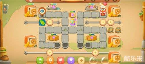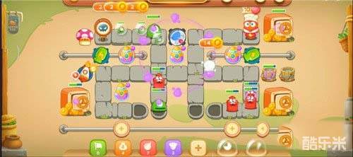 开局的话,还是建议大家使用金币加成的道具,然后使用火龙果清除左侧道路的障碍物,然后在中间放毒气瓶,升到最高级用来打怪以及清除周围的障碍物,再在左侧的滑道上放瓶子炮,升级瓶子炮用来打左上角的金币箱子;