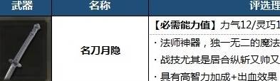 本作中魔法剑士推荐选择的武器为「名刀月隐」,虽然也可以选择智力加成很高的「暗月大剑」和「夜与火之剑」,但「名刀月隐」更为适合。