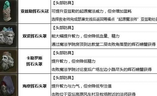 头部以外的防具基本没有特殊的具有魔法强化效果的装备,因此除了头部防具之外其他部件怎么帅怎么选就行。本作中具有魔法强化的头部防具基本都是辉石头。