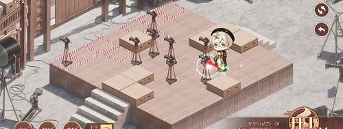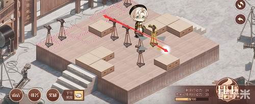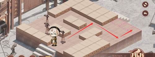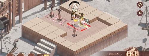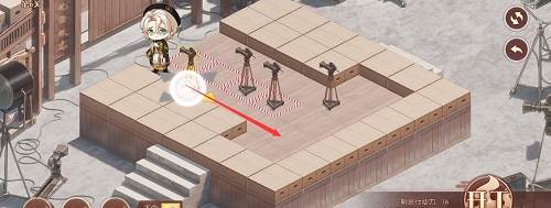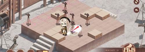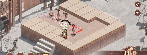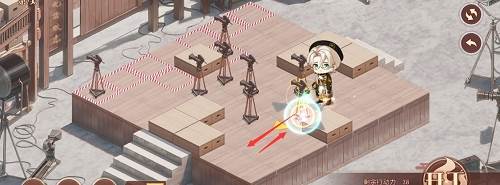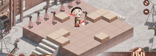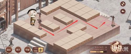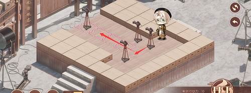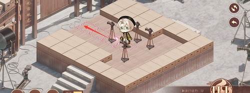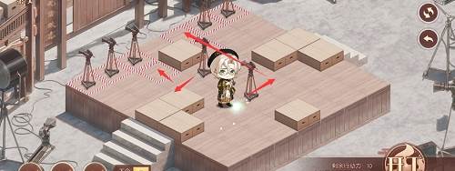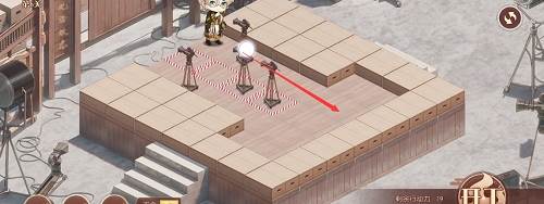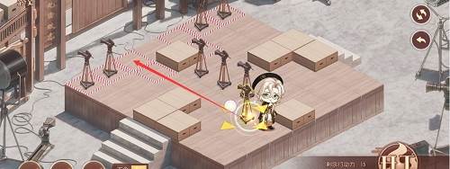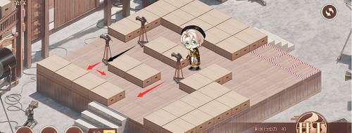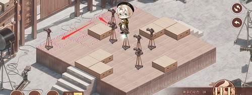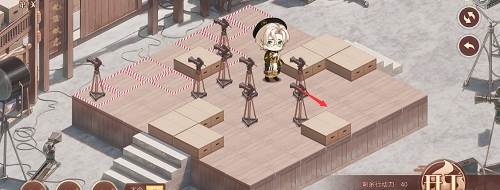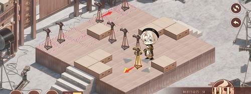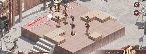 1、先推下面的摄像机,往前推两格,在去推上面红色路线的摄像机,推到下面,最后把第三个推到黑色的标记的位置就行了,形成下图的样子。