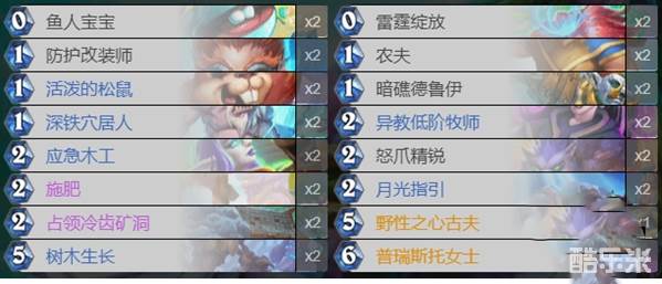 1费:防护改装师x2;农夫x2;活泼的松鼠x2;暗礁德鲁伊x2