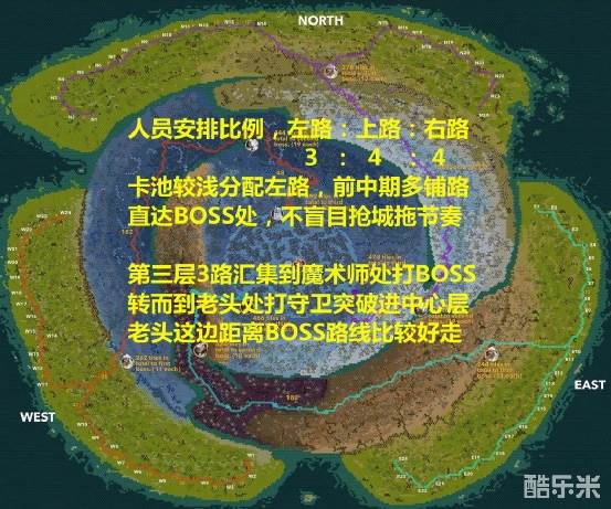 分路 主力走右路和上路卡池相对较弱的人员选择左路,分配若干大佬协助左路突破某些拦路城池。切记,左路人数不能过少,否则铺路速度过慢会影响打1王&2王进程。