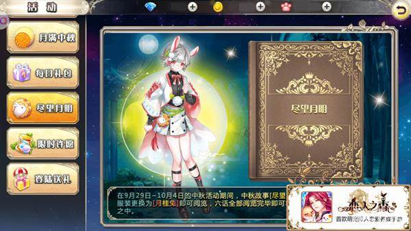 长假即将来临,各位小公主们是不是已经迫不及待准备迎接假期了呢?我们的尼尔殿下已经先大家一步开启了过节模式,9月29日——10月4日期间,尼尔会换上了美美的中秋套装,变身仙萌“月桂兔”!《恋人之森》换装系统正式上线,以后将会有更多王子的新套装陆续上架哦!喜爱“月桂兔”套装的小伙伴们,一起来看看吧!