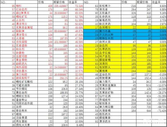ps:此表以完美方案为准,其他方案会有点失真,不过大体没什么变化。还有就是,价格是1星的价格,3星成品收益率会更高,以及此表仅看净收益率哈,材料获得效率以及售卖效率并没有计算,注意此表收益率并非表示单位时间售卖价格,有些材料可能收益高但是换钱效率低(这个开始没发现,这两天算算看,可能要等会)因此仅供仓库或者部分材料充足的时候参考。