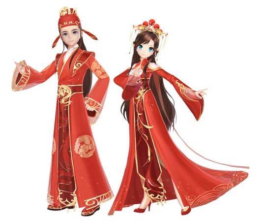 飘飘长发梳理成新郎官的模样,红色官服上纹绣着金龙凸显贵气;红色大婚礼服上点缀凤凰纹饰,饱含着家人对出嫁女儿最美好的祝福。