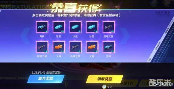 ●先抽后付:车手们每周可获得一次十连抽(先抽后付)的机会;抽取后可根据抽奖结果选择是否需要,需要则扣除对应数量的梦想币,不需要则放弃奖励。(弹框一旦关闭,则默认放弃,无法找回奖励,车手谨慎选择!)