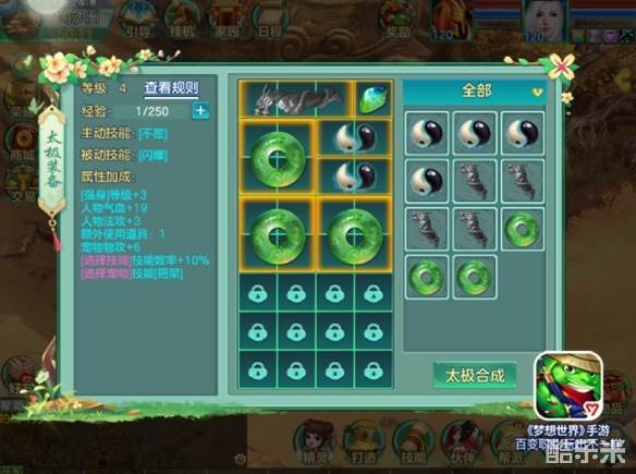 (1)“太极图”可镶嵌太极道具为人物和宠物提供各项加成。