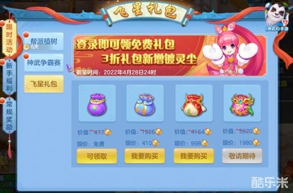 2022年3月11日维护后至2022年4月28日24:00期间,飞星礼包限时上架:等级达到30级的玩家可免费领取第一档礼包,另有三款超值特惠礼包可供选择购买;原战戒制造书替换为等价值镀灵尘;2022年3月11日维护后至2022年4月1日8:00期间,奇货商城限时出售宠物装备礼包,礼包中包含宠物装备、镀灵尘道具,3折助力装备觉醒。