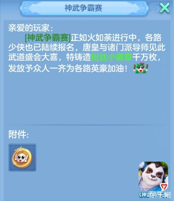 各位三界少侠可以通过支持神武争霸赛参赛选手成为其粉丝并获得专属特殊称谓;新增粉丝道具“粉丝小徽章”,所支持选手在预选赛或淘汰赛中获胜则粉丝徽章增加1星,支持同帮选手可以额外获得2星,最终领奖时星级越高奖励越好;每个阶段结束会根据所支持选手当前阶段的成绩向众粉丝发放一次争霸赛积分。支持选手失去比赛资格或全部比赛结束时方可领奖,领奖后即失去重新支持其他选手的资格;支持选手失去比赛资格后,可以消耗一定代价或向好友求助从而重新获得支持资格。