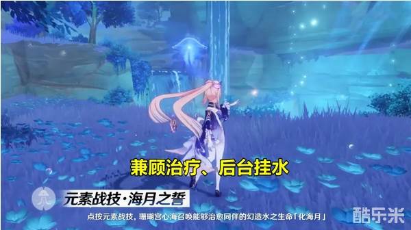 开启E技能,召唤一只驻场12秒的水母,技能冷却20秒。水母每2秒造成一次范围水伤,同时治疗前台角色,9级水母的输出倍率为185.6%,治疗效果为“生命值上限*7.5%+862”。