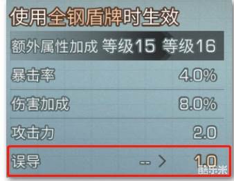 2、当护盾的配方专研等级在16-19级和36-39级时,每升一级可获得一点误导值,共可获得8点误导值,即当护盾的配方专研等级达到39级时一共可获得14点误导值。