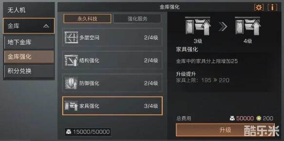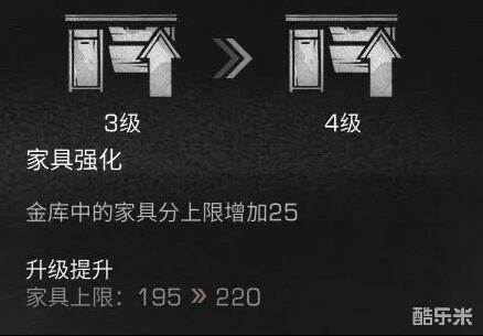 2、建议将家具强化提升到三级,金库可容纳的柜子数量,可以直接提升至195个,就连爱囤积的幸存者看见了也会直呼过瘾吧!