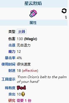 星云烈焰是一把困难模式、拜月教邪教徒后的魔法武器,能自动开火,会射出粉红色的、高速的射弹,如果附近有敌怪就会自动导向其上,并有 20% 几率随机改为发射更大、更快的蓝色射弹,能造成三倍伤害。