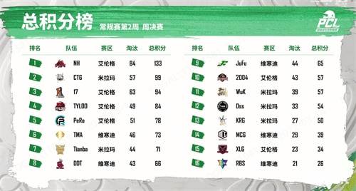 【Krafton Inc.旗下PUBG工作室】奋勇争先,龙吟四海!2022年绝地求生冠军联赛(PUBG CHAMPIONS LEAGUE,简称“PCL”)春季赛常规赛的第二周比赛已经结束。回顾本周精彩纷呈的较量中,涌现各种惊险刺激的场面。NH战队雷霆出击,单日斩下96分,以84淘汰、133总积分的绝对优势卫冕第二周周冠军的宝座。CTG战队后来居上,以57淘汰,99总积分的微弱优势力压17战队拿到周亚军。17战队本次周决赛门票之路可谓是十分坎坷,以十足的韧性63淘汰,94总积分坐稳周季军之位。周中赛表现亮眼的TYLOO战队在本周周决赛中以84分保住第四位置。