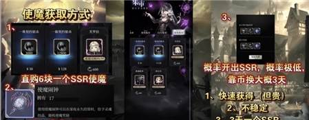 不常规的获取方式为:命运之轮等的氪金活动里获得,其中:命运之轮结合氪金礼包获取使魔速度最快,平均12块就可以获得8只SSR使魔,和白嫖3天一只SSR使魔速度比快的不是一点半点。