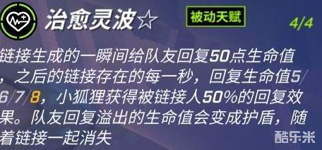 链接生成的一瞬间给队友一定生命值,此后链接的每一秒,回复一定生命值,同时小狐狸可以获得被链接人一半的治疗效果。
