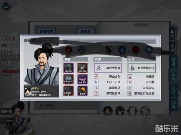 武学:主:墨子或太极拳:辅:霹雳加命中,黑衣加集气,天心一刀和天山古剑加buff