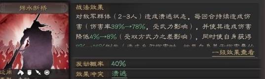 据水断桥:对敌军群体(2-3人)造成溃逃状态,每回合持续造成伤害(伤害率39%→78%,受武力影响),并使其造成伤害降低4%→8%(受双方武力之差影响),同时使自身获得8%→16%倒戈(造成兵刃伤害时,恢复自身基于伤害量的一定兵力),持续2回合,该战法发动后会进入1回合冷却。