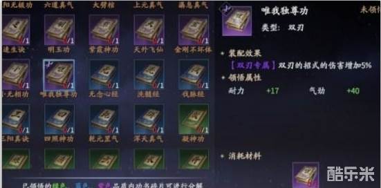 《月下断魂》、《神照经》、《纯阳无极功》、《唯我独尊功》这些都是双刃的专属内功,红色、橙色品级的内功比较稀有,所以这里推荐带《唯我独尊功》,它可以为双刀的伤害增加5%,非常稳定。剩下的,带上《拈花指》提升命中率,《长生诀》增加对定身敌人的伤害,《玄天指》增加续航能力,《清心诀》提升防御力。内功可视伤害需要,根据实际情况更换。比如说追求“龙瘴”的持续性输出时,可以将《长生诀》换成《四照神功》持续减速敌人,《拈花指》换成《炼筋诀》,打出破防输出。