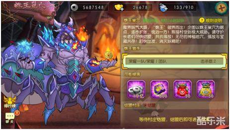 说明:当村庄到达4级之后,就可以和其他村庄结盟后一起挑战蛛王巢穴,冠军村长是必定能获得1个亿银币奖励的,冠军村民是5000万银币奖励。所有挑战村庄最后根据村庄英雄榜,获得不同的丰厚奖励。