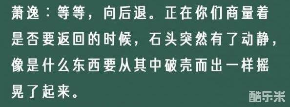 萧逸:等等,向后退。正在你们商量着是否要返回的时候,石头突然有了动静,像是什么东西要从其中破壳而出一样摇晃了起来。