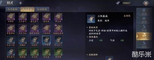 《破虏令》、《嫁衣神决》、《寒冰真气》、《龙象般若功》都是琴的专属内功,红橙等高等级内功较难获得,这里主要说一下紫色《龙象般若功》,它可以增加琴的招式伤害5%,提升所有技能的输出上限,搭配上《乾元罡气》《伐脉经》等蓝色内功,还可提升辅助能力,控制、回血能力提升,琴职业玩家本身的站场能力也有保障。如果想要选择输出的话,推荐《三阳真诀》,对定身/封招/眩晕敌人会额外造成伤害,适合琴这种控制频繁的武器。