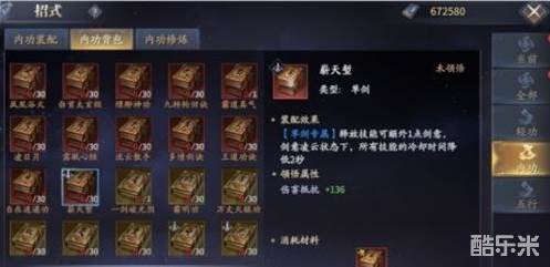 1.在内功选择方面,单剑专用内功四种,《崭天堑》释放技能额外增加剑意值,凌云状态下所有技能冷却时间降低2秒;《夺命连环腿》每次获得剑意时增加15%的伤害;《先天功》受到伤害时,增加10%的移速;《太玄功》招式增加5%的伤害。大家可各取所需。