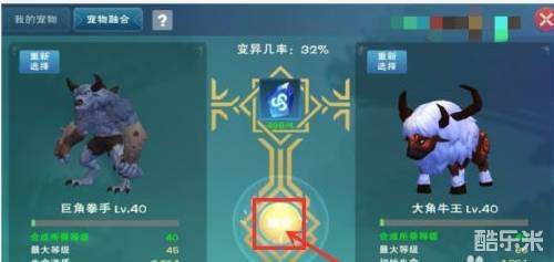 稀有饲喂肉(20个保底)接着我们开始来融合宠物,点击菜单图标,点击【宠物】,点击【宠物融合】,点击左右两边的加号。点击两边的加号,把两只35级大角牛添加进入融合界面。点击融合按钮后,我们得到了【巨角拳手】。