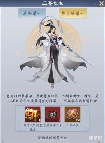 其中总榜前三名可获得限时称号;各势力榜第一名可获得限时时装首次取得总榜/势力榜第一更可获得额外丰厚奖励。