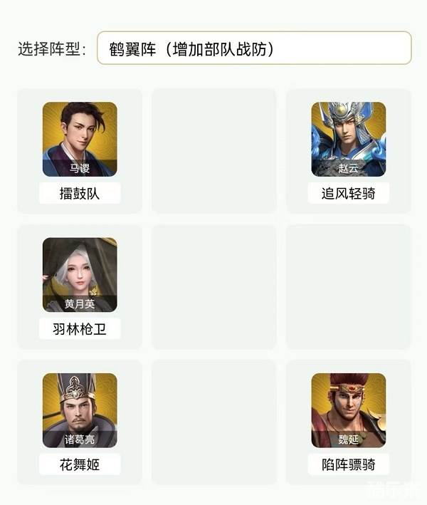 武将兵种搭配赵云(追风轻骑)魏延(陷阵骑兵)马谡(擂鼓队)黄月英(羽林枪卫)诸葛亮(花舞姬)