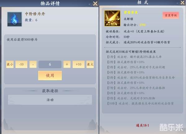 技能招式同样也是有等级进阶,招式达到10级就会解锁一阶特殊效果;那么问题来了,如何升级招式呢,除了每天挂机产生的修为外,还想快速升级的话,那就得谈到平时道友们冲关卡打boss掉落的修为丹了(有急需的小伙伴在商场也可以买到哦),也不必担心前期把修为拿来培养了低品质的招式,我们的招式系统是可以免费重置等级的哦,可以放心去培养升级。下图例就给大家看看。
