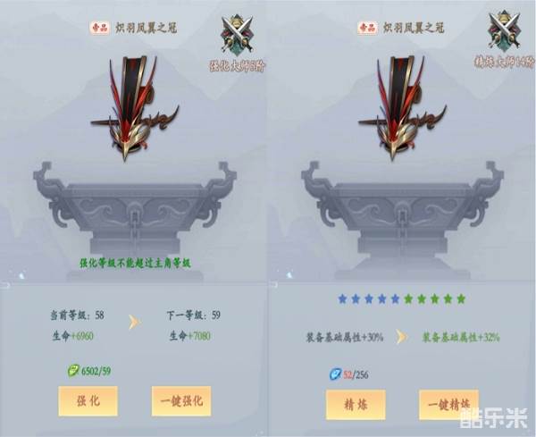 精炼装备:而精炼与强化不同是它不随角色等级而变动,精炼会百分比提升当前穿戴装备的基础属性。和强化一样,会有等阶属性提升。