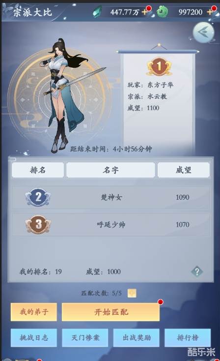 5.派遣弟子将采取车轮战的形式,迎战对手宗派等级最高的5名弟子,战胜即可获得威望;