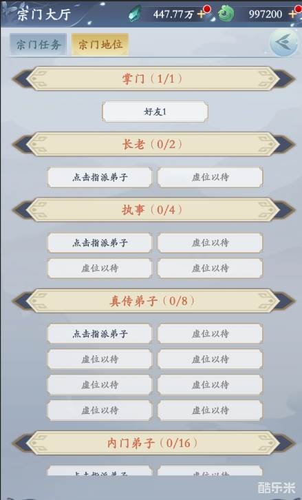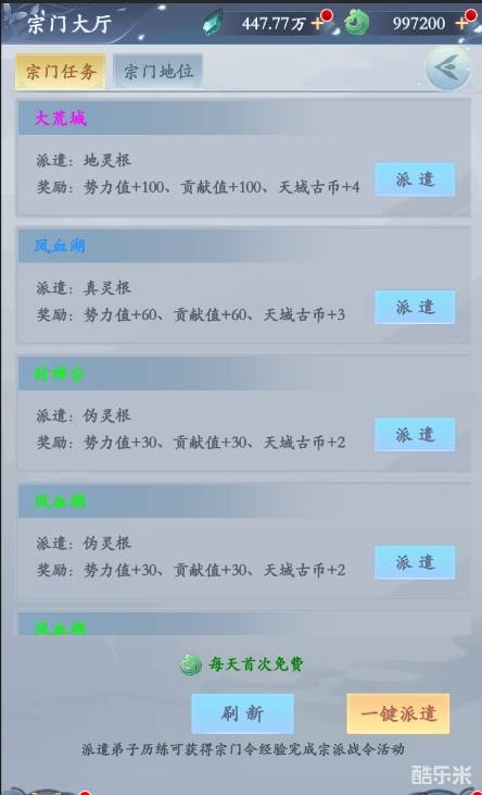 宗派大殿:宗派大殿每日会刷新一定数量的宗门任务,宗门任务有品质区分,品质越好的任务,奖励越丰富,对弟子资质的要求也越高;玩家还可以此建筑升降弟子的职位,每样职位都最低贡献值的要求,弟子职位提高,能进入更高级的练功房。