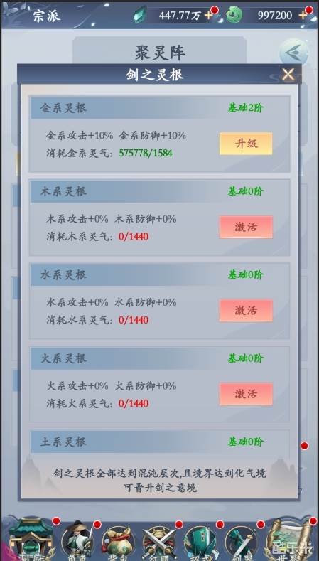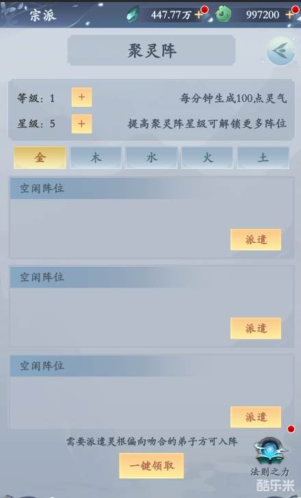 聚灵阵:玩家可以在聚灵阵内安排弟子收集对应的五行灵气,弟子资质越高,五行灵气收集的速度越快。玩家可以通过花费仙玉提高聚灵阵星级,可以上阵更多弟子一起收集灵气;也可以花费灵石提高聚灵阵等级,提高灵气收集速度,但聚灵阵等级不能超过宗门等级(宗门坐化流:通过坐化弟子快速提高宗门等级,然后再升级聚灵阵等级,提高单次灵气的收集速度,用少量的弟子也可以收集大量的灵气);收集到的灵气可用于升级五行法则之力,法则之力用于提升五行攻击、防御的百分比加成,但法则之力讲究均衡,五行之力的阶级需要一起提升。