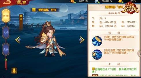 飞升3:[隐身]状态下释放技能时,目标每有1%的御甲,朔月张郃附加自身2%攻击力的间接伤害。