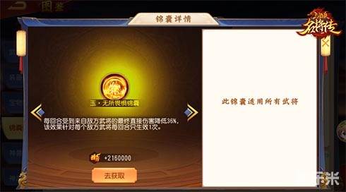 玉•无所畏惧锦囊:每回合受到来自敌方武将的最终直接伤害降低36%,该效果针对每个敌方武将每回合只生效1次。