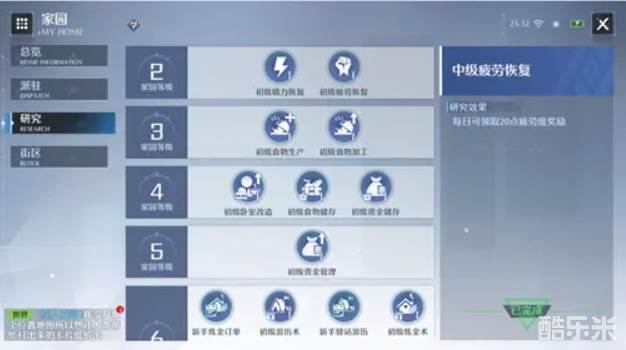 随着家园的等级提升,从二级家园开始,每一级都有相对应的科技供我们研究,随着每项科技的完成对后续的游戏体验都能带来不小的提升;游戏前期缺体力后期缺精力,虽然研究的冷却不算长但也可以根据自身的需求合理分配。